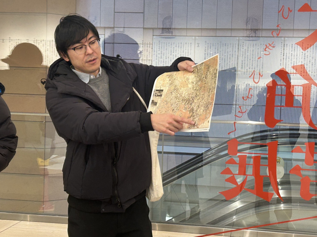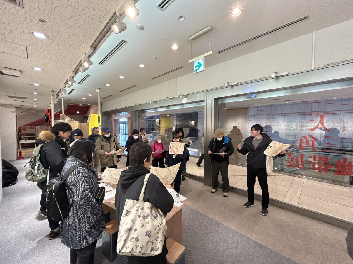 三軒茶屋駅前の国道246号線と世田谷通りの分岐点に挟まれた商店・飲食店が並ぶ通称「三角地帯」をテーマにした展覧会「三軒茶屋 大三角地帯展-ひらき、ひもとく記憶と記録-」の関連イベント「古地図でめぐる三角地帯」が2月7日に開催された。