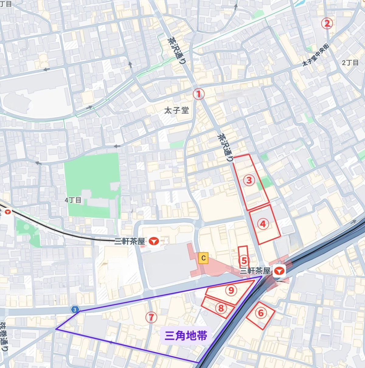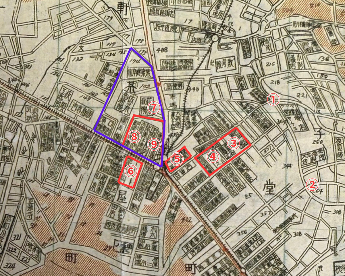 まち歩きしたスポット。三角地帯(8)(9)エリアには多くの飲食店・商店が立ち並ぶ