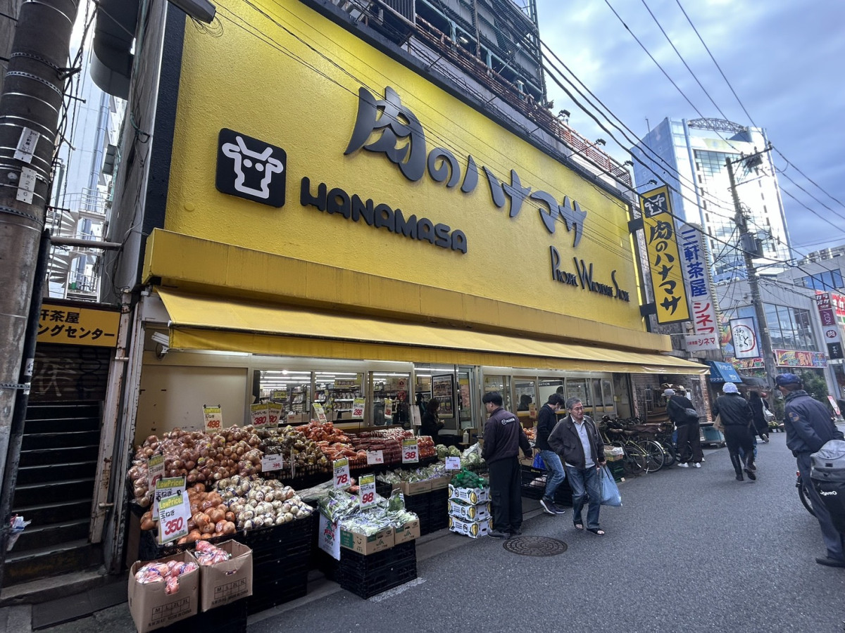 「三軒茶屋シネマ」跡地は「肉のハナマサ」に。看板は今も残っている(写真奥)。ハナマサの上は休業中の「三軒茶屋バッティングセンター」