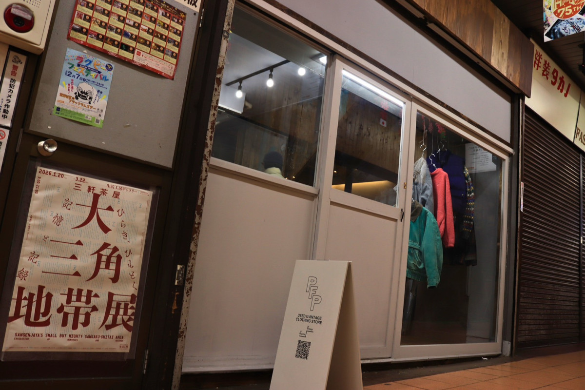 「絵れ菜」の向かいの古着店「PFP CLOTHING STORE」2階販売スペースから見たアーケードの内部