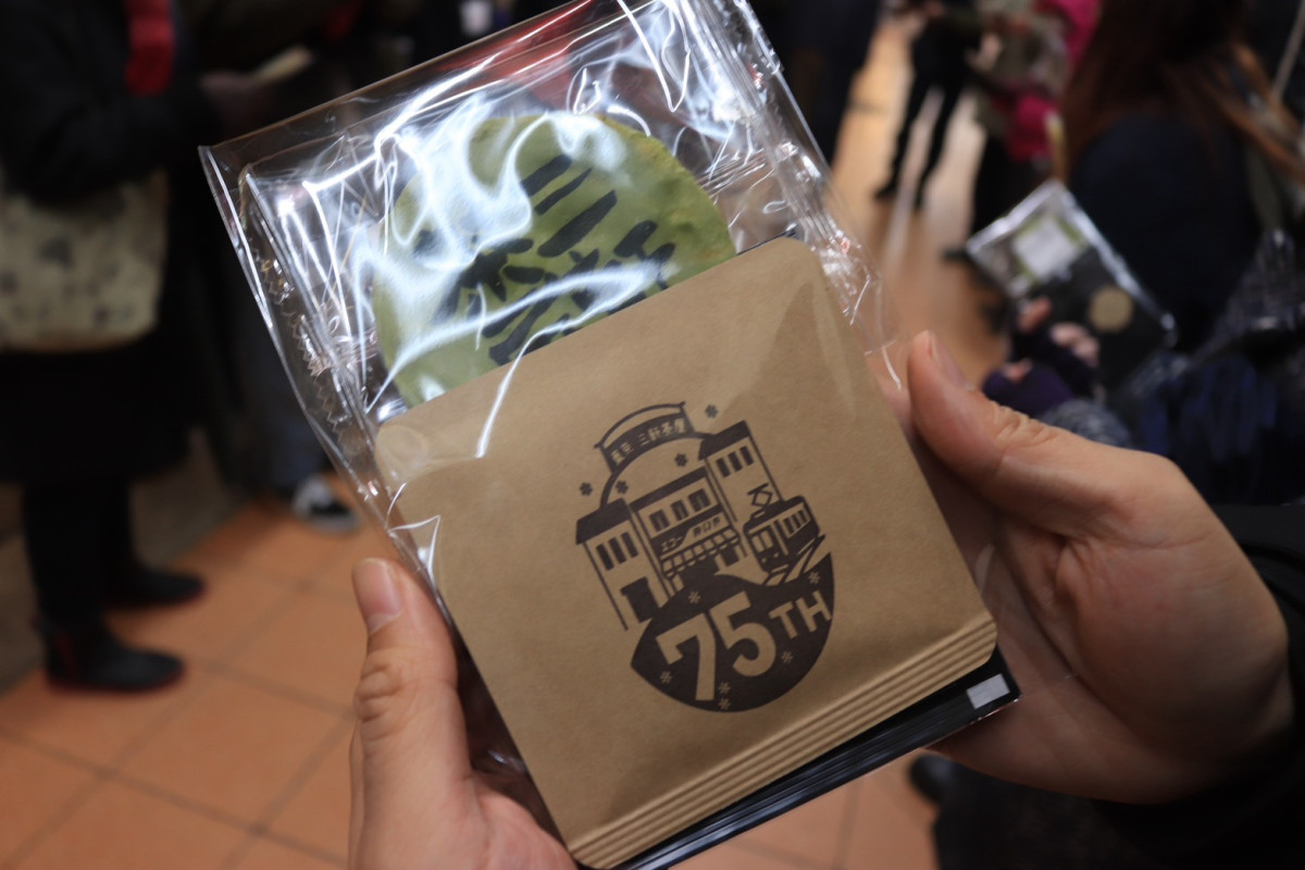 村上さんから参加者に配られた「エコー仲見世商店街」75周年記念のドリップコーヒーと茶葉ブレンド、抹茶煎餅のセット