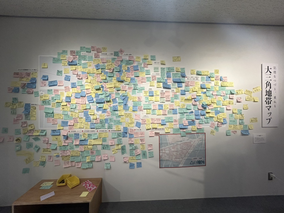 「大三角地帯展」内の三角地帯周辺マップ。来場者による情報や思い出が書かれた付箋紙で埋められている。最終日まで、三茶を知る人たちの情報や資料も随時募集している