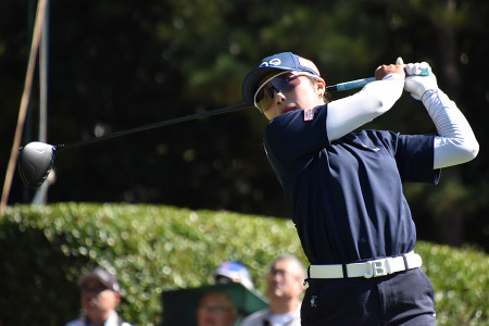 延田マスターズGCレディース第2日。首位タイで出た佐久間朱莉が連日の66をマークし、通算12アンダーで単独トップに立った=24日、兵庫・マスターズGC 【時事通信社】