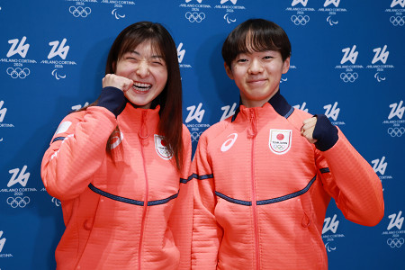 2月6日に開幕するミラノ・コルティナ五輪で、フィギュアスケート日本代表の一部選手らが29日、ミラノ・マルペンサ空港に到着した。写真は笑顔で撮影に応じる坂本花織(左)と鍵山優真。 【時事通信社】