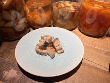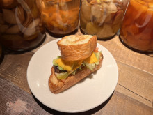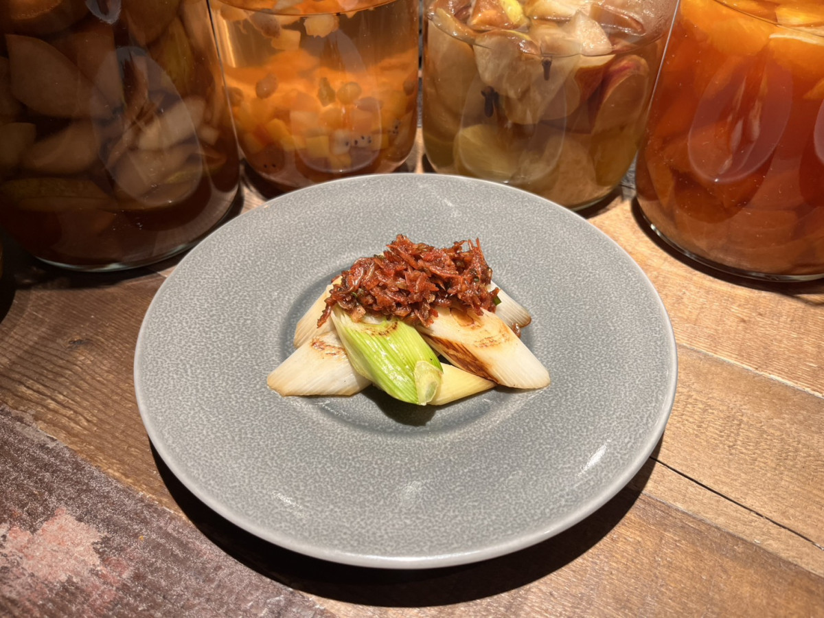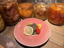 メニューは、「里山れんこん-青海苔(のり)からし明太(めんたい)マヨ-」(770円)、「江戸千住葱(ねぎ)-海老(えび)辣油(ラーユ)-」(770円)、「あん肝大根」(1,100円)、「鰆(さわら)幽庵(ゆうあん)ムニエル-法蓮草(ほうれんそう)ソース-」(1,210円)、「フランスマッシュバーガー」(1,320円)など。ドリンクは、国産ハーブをブレンドした茶で作る茶割りや漬け込み酒のサワーなどを用意する。